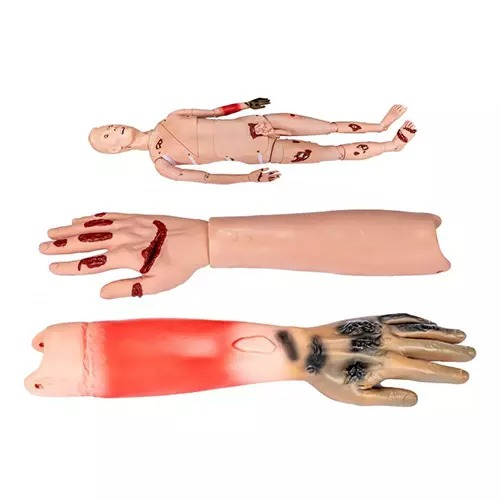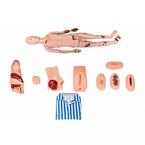 | Beschrijving | 1. Borstwand: 2. Abdominale muur 3. Buikwond met verwijdering van de dunne darm; 4.Dij en benen 5. Schouder en armen: 6. Zorg voor infectieuze ulcera (been) 7. Amputatie van de bovenarm en wondverzorging 8. Beneden knieamputatie en wondverzorging 9. Voet gangreen en verschillende teenwonden; 10. Gezichtswonden 11.Diverse brandwonden (gezicht/extremiteiten) 1, 2, 3 graden 12. Diverse fracturen (dijbeen, scheenbeen, sleutelbeen, opperarmbeen en hand) 13. Geweerschotverwonding hand 14. Amputatiestomp van de bovenarm 15. Amputatiestomp van een been 16.Functie: Amputatiestomp van een leFunctie: Trauma-evaluatie en verzorging van de traumapatiënt 17. Een grote verscheidenheid aan simulatieblessures 18. Simulatietraining over het omgaan met snijwonden en het verzorgen van een groot aantal wonden in de volgende delen van het lichaam |